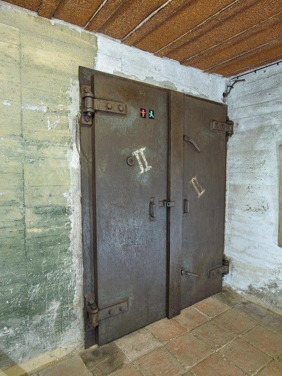 Vue intérieure : entrée, porte blindée de type B8 à deux battants (en position fermée). Ce bunker-musée a pour thématique la Seconde Guerre mondiale et la batterie d'artillerie antiaérienne RossittenImmatriculation