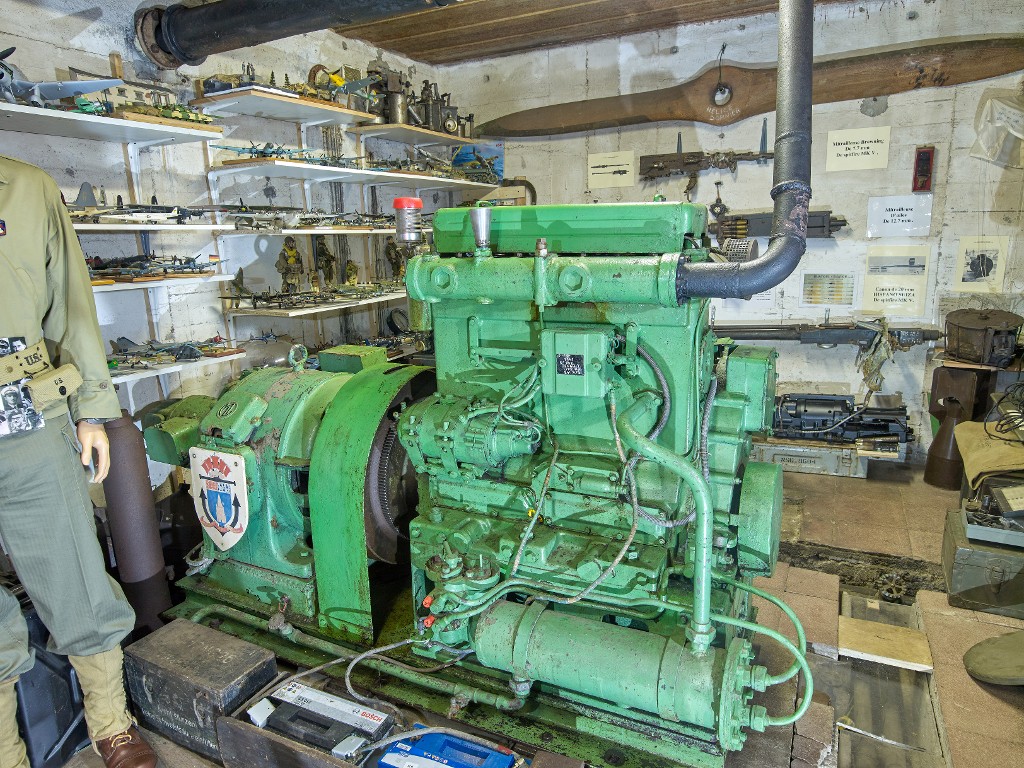 Vue intérieure : salle des machines pour deux groupes électrogènes, moteur Renault type D7, n° 152, 1941 (déplacé, ce moteur provient de la centrale électrique de Kernével à Larmor-Plage). Ce bunker-musée a pour thématique la Seconde Guerre mondialeImmatriculation