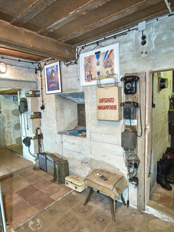 Vue intérieure : atelier. La porte blindée n'a jamais été posée. L'installation téléphonique est rapportée. Ce bunker-musée a pour thématique la Seconde Guerre mondiale et la batterie d'artillerie antiaérienne RossittenImmatriculation
