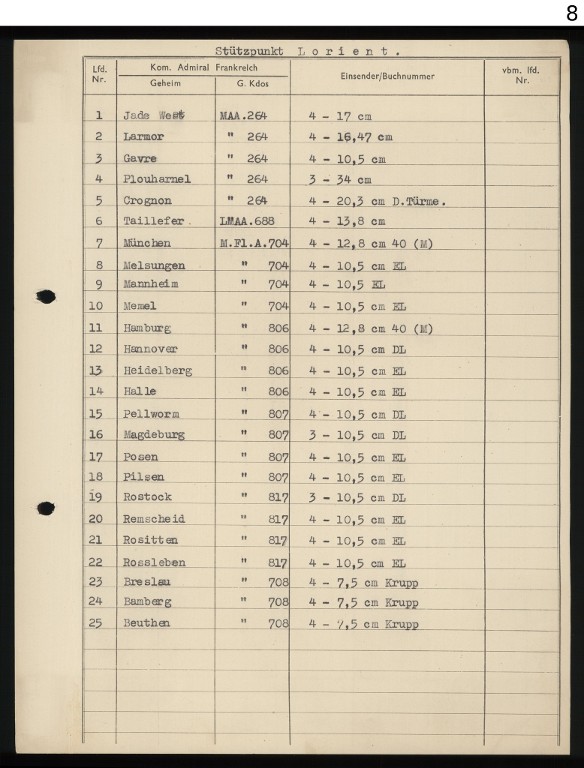 Liste des batteries d'artillerie du point d'appui lourd de Lorient, Stützpunkt Lorient (source : Bundesarchiv, 45 IV/1452 fol. 1)Immatriculation