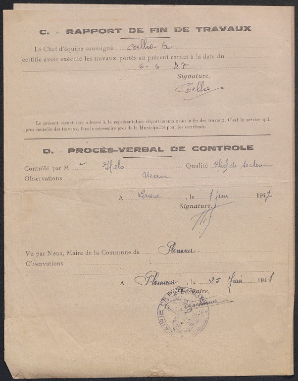 Archives du déminage Finistère-Morbihan : carnet de travail de désobusage pour le lieu-dit Breuzent, mai-juin 1947 (source : Archives départementales du Finistère, FRAD029_2264W_017_06_203)-