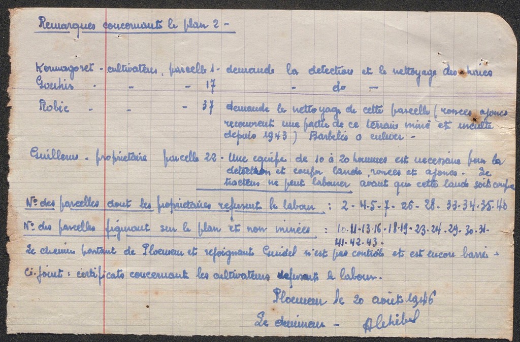 Archives du déminage Finistère-Morbihan : remarques du démineur concernant le plan n° 2, 20 août 1946 (source : Archives départementales du Finistère, FRAD029_2264W_017_06_351)-