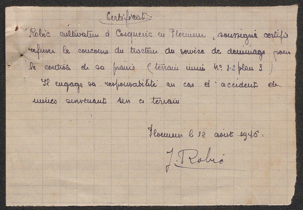 Archives du déminage Finistère-Morbihan : certificat rédigé et signé par Joseph Robic concernant des parcelles du plan n° 3, 12 août 1946 (source : Archives départementales du Finistère, FRAD029_2264W_017_06_361)-