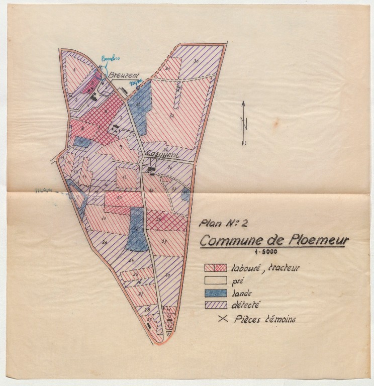 Archives du déminage Finistère-Morbihan : commune de Ploemeur, plan n° 2, lieux-dits Cosquéric et Breuzent, 1946 (source : Archives départementales du Finistère, FRAD029_2264W_017_06_366)-