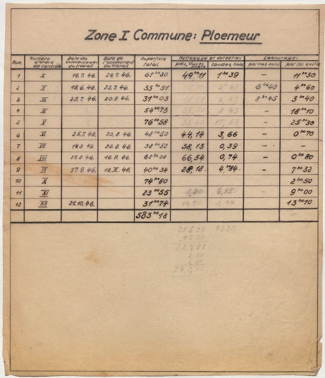 Archives du déminage Finistère-Morbihan : commune de Ploemeur, tableau récapitulatif de la zone I (source : Archives départementales du Finistère, FRAD029_2264W_022_136)-