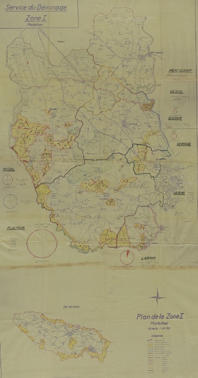 Archives du déminage Finistère-Morbihan : service du déminage, carte de la zone I avec les champs de mines, les terrains présumés minés et les emplacements de bombes, 1er novembre 1946 (source : FRAD029_2264W_022_176)-