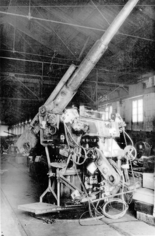 Vue de trois quarts avant de l'un des canons de 10,5 cm de la batterie d'artillerie antiaérienne Rossitten entreposé à Lorient en 1947 (collection : Jean Robic)Immatriculation