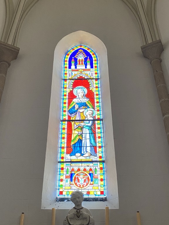 Ensemble de 7 verrières à personnages des baies 0 à 6 : Éducation de la Vierge, Saint Joseph, Saint Fiacre, Donation du Rosaire, Immaculée Conception, apparition de lourdes, Sacré-Cœur et Sainte Marguerite-Marie Alacoque, Sacré-Cœur, Crucifixion, église Sainte-Zéphirine (Tréal),