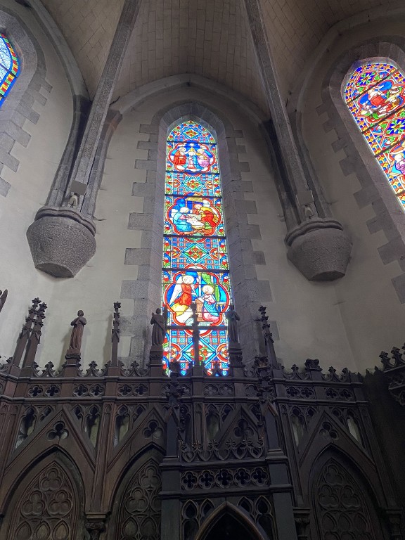 Ensemble de 13 verrières à personnages des baies 0 à 12 : Scènes de la vie et de la Passion du Christ, Saint Louis, Françoise d'Amboise, Vierge à l'Enfant, église paroissiale Notre-Dame (Campénéac),