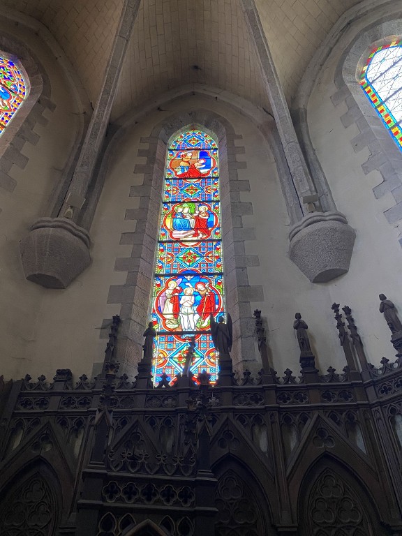 Ensemble de 13 verrières à personnages des baies 0 à 12 : Scènes de la vie et de la Passion du Christ, Saint Louis, Françoise d'Amboise, Vierge à l'Enfant, église paroissiale Notre-Dame (Campénéac),