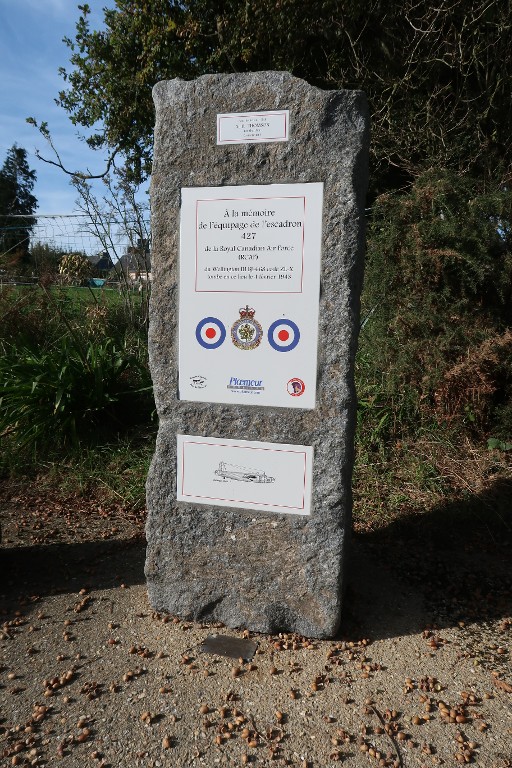 Vue de la stèle centrale du monument à la mémoire de l'équipage de l'escadron 427 de la Royal Canadian Air Force. On peut lire : À la mémoire de l'équipage de l'escadron 427 de la Royal Canadian Air Force (RCAF) du Wellington III BJ-668 codé ZL-X tombé enImmatriculation