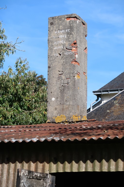 Vue du baraquement-cuisine-logement du cuisinier : souche de cheminée avec son inscription et millésime tracés dans l'enduit frais puis peint. On peut lire : H.RAMCKE/1942/HUMMEL/HUMMEL/MORS MORSImmatriculation