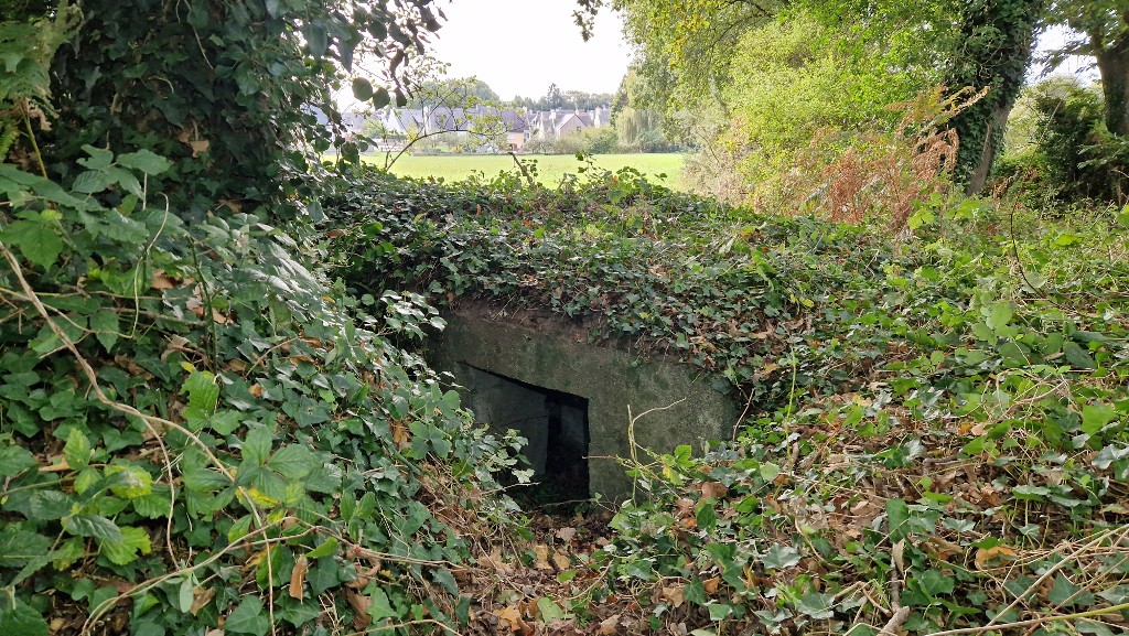 Vue générale du bunker-poste d'observation et de tir dit Tobruk-Stand ouest (1). On distingue l'entrée du bunker tournée vers le chemin au nord. Le bunker est partiellement envahi par la végétationImmatriculation