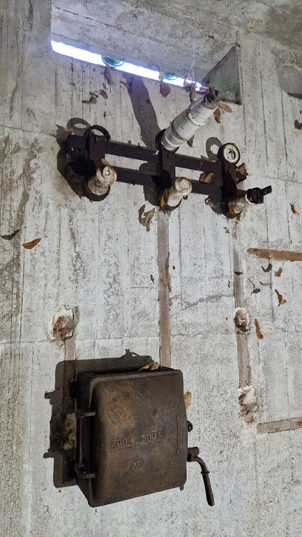 Vue intérieure : arrivée des câbles du réseau électrique. Les câbles alimentaient en électricité la batterie antiaérienne via un transformateur. Le boîtier a été ajouté plus tardImmatriculation