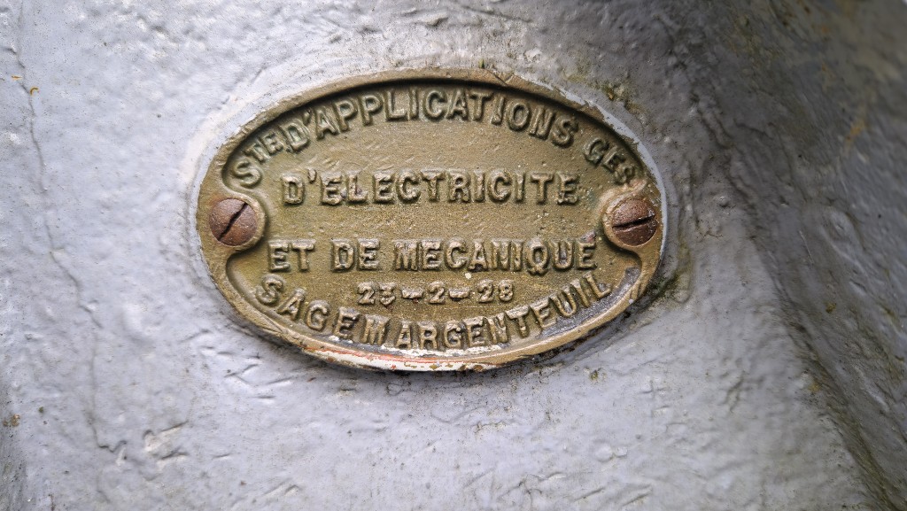 Vue de l'une des deux plaques constructeur de l'affût du canon contre avion Schneider de 90 mm : S[ocié]TE DAPPLICATIONS G[énéral]ES/DELECTRICITE/ ET DE MECANIQUE/23-02-28/SAGEM ARGENTEUILImmatriculation