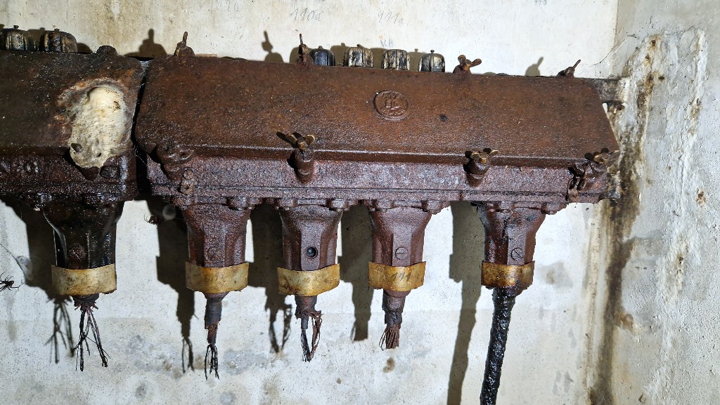 Vue intérieure : ensemble de plusieurs boîtiers de connexion (boîtier implanté à droite). Sur le mur peint en blanc : des instructions tracées au crayon gris pour connecter les câblesImmatriculation