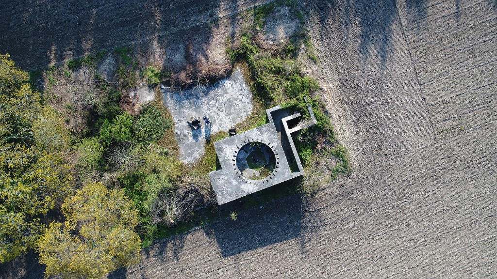 Vue aérienne verticale du bunker-poste de direction de tir de type Fl244 SK pour télémètreImmatriculation