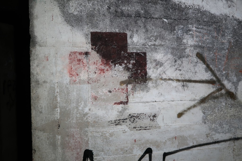 Vue intérieure : flèche peinte en noir et croix rouge indiquant l'infirmerie. Les murs sont couverts de graffitisImmatriculation
