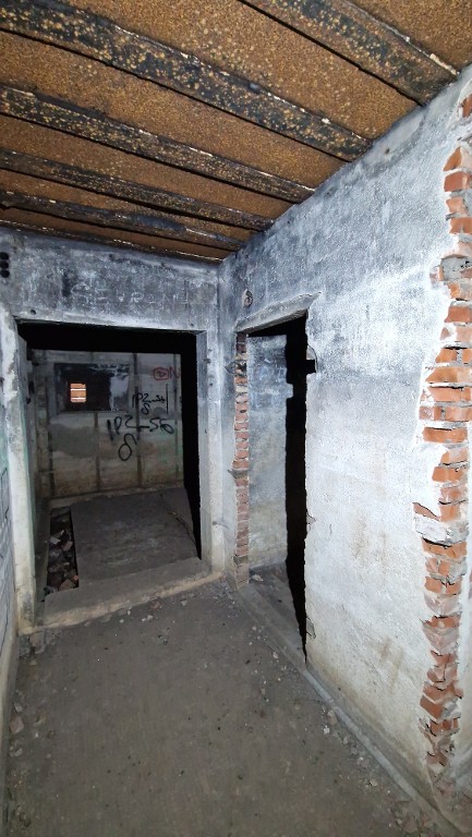 Vue intérieure : chambre d'officier avec cloison en briqueImmatriculation