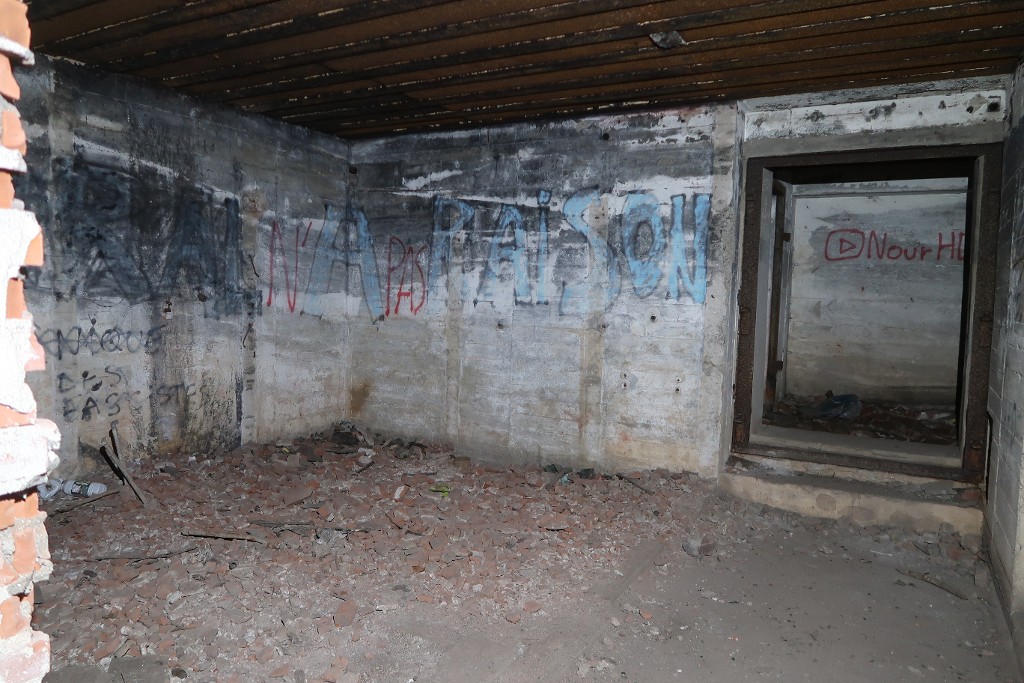 Vue intérieure : emplacement d'une chambre d'officier et de sanitaires (water-closets et lavabos). Les cloisons en brique ont été détruitesImmatriculation
