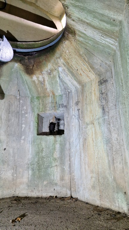 Vue intérieure du bunker-abri de type 621 pour un groupe de combat : poste d'observation. Sur le mur est peint un panorama de tir. Dans la petite niche murale, se trouve un tuyau acoustique relié à la salle de gardeImmatriculation
