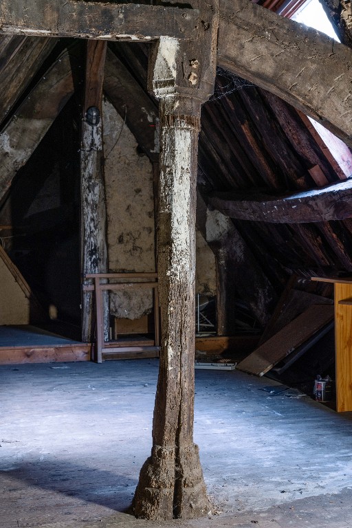 Quatrième ferme depuis la rue avec poinçon sculpté. Une jambette arquée a été remplacée. En arrière-plan, la troisième ferme n'a pas de poinçon orné et une cloison en torchis occupe la partie droite.Immatriculation