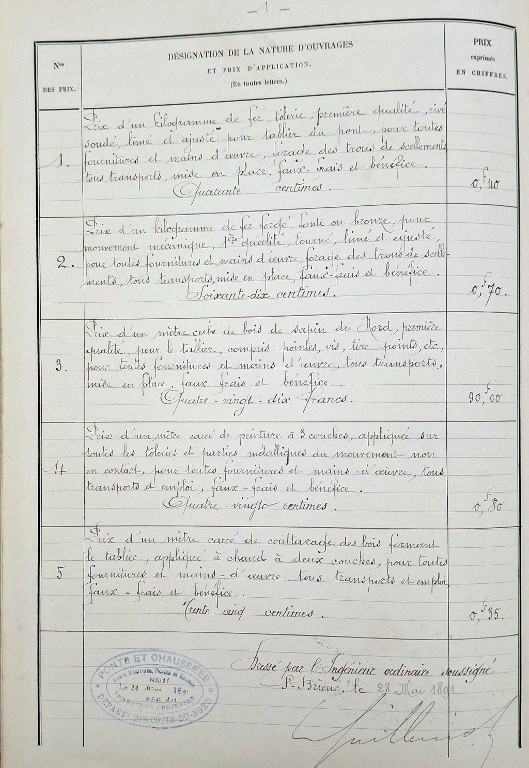Document d'archives : extrait des prix appliqués aux matériaux de construction (28 mai 1891)Immatriculation