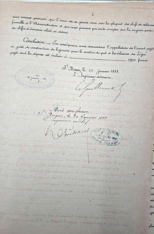 Archives départementales des Côtes-d'Armor, S. supp 258, Avant-projet de construction de ogements pour le maître de port et les éclusiers, rapport de l'ingénieur ordinaire Guillemoto, 28 janvier 1888.