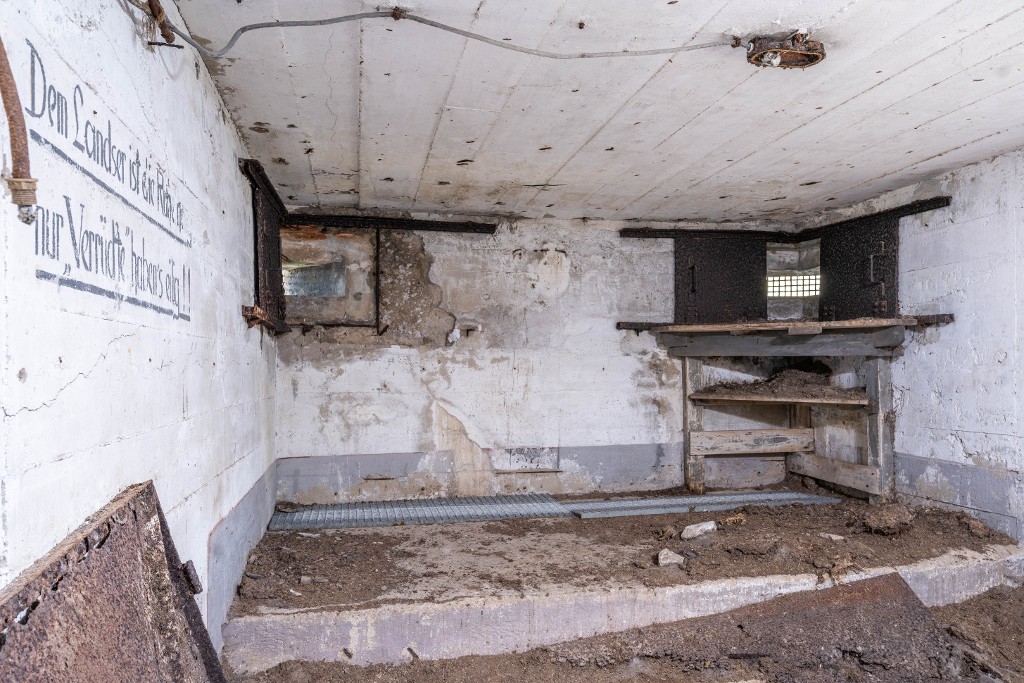 Vue intérieure : ouvertures de tir avec double volet blindé et support d'affût en bois pour mitrailleuse (état en 2026). A gauche : peinture murale de propagande. On peut transcrire : Dem Landser ist die Ruhe neig / Nur Verrückte habens eilig !!Immatriculation