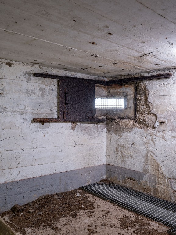 Vue intérieure : ouverture de tir avec double volet blindé (état en 2026). Au niveau du sol : ouverture de tir rappelant les mâchicoulisImmatriculation