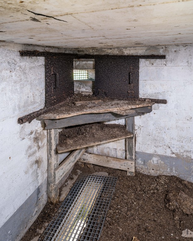 Vue intérieure : ouverture de tir avec double volet blindé et support d'affût en bois pour mitrailleuse (état en 2026). Au niveau du sol : ouverture de tir rappelant les mâchicoulisImmatriculation