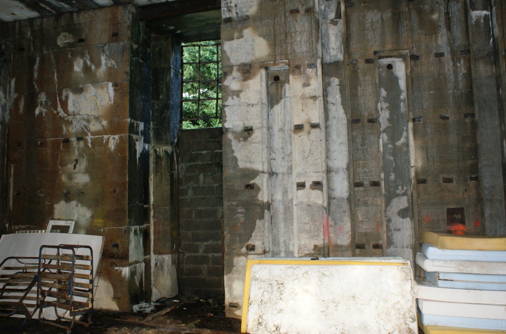 Vue intérieure : ouverture étroite de l'élévation ouest (état en 2013). La partie basse est murée par des parpaingsImmatriculation