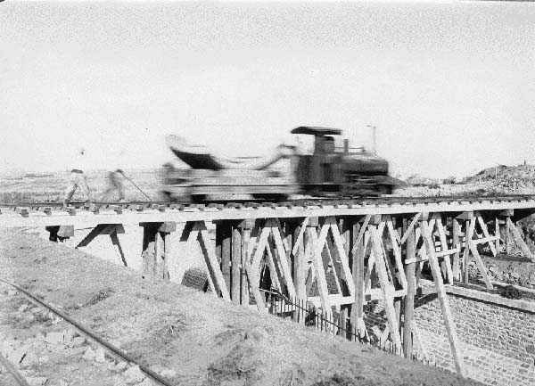 Vue du chantier de construction du réduit, vers 1902-1906 : locomotive tirant un wagonnet transportant une avant-cuirasse (elle est en trois pièces). La voie ferrée de type Decauville été aménagée pour passer au-dessus du fossé secImmatriculation