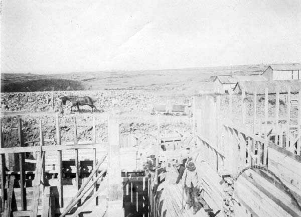 Série de photographies du chantier de construction du réduit de la Croix-Saint-Michel à Ouessant (1902-1906). Photographies prises, soit par l’architecte François Sylvain Crosnier (1859-1950), soit par son frère Auguste Crosnier, polytechnicien, capitaine sur l'île d'Ouessant. Collection : Christophe Grunweiser publiée dans le site Index de la fortification française 1874-1914 - Fortiff.be, dédié aux fortifications européennes de la fin du 19e au milieu du 20e siècle.