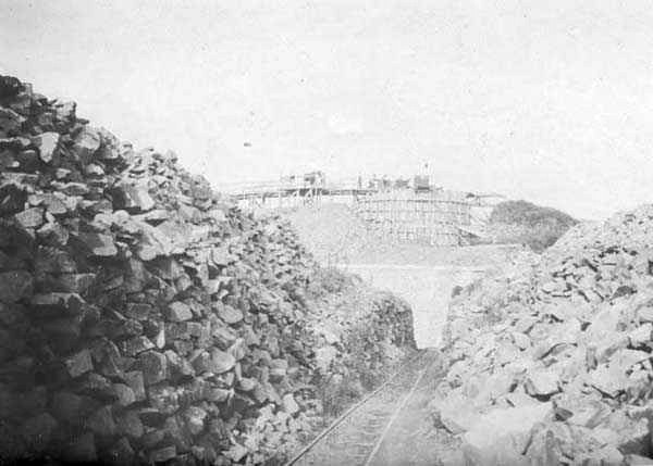Vue du chantier de construction du réduit, vers 1902-1906 : au premier plan, une voie ferrée de type Decauville passe à travers le futur glacis. En arrière-plan : coffrage du puits de l'une des deux tourelles pour canons de 75 mmImmatriculation