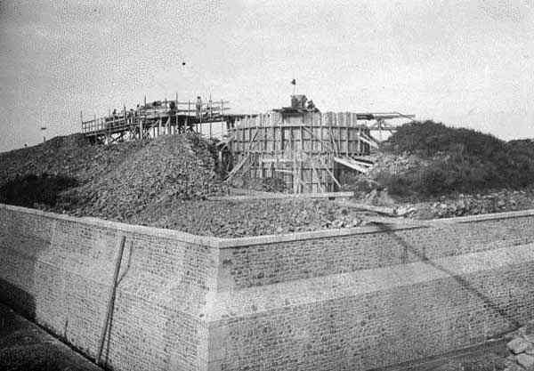 Vue du chantier de construction du réduit, vers 1902-1906 : coffrage du puits de l'une des deux tourelles pour canons de 75 mm. Au-dessus : voie ferrée de type Decauville sur laquelle évoluent deux wagonnets tirés par un chevalImmatriculation
