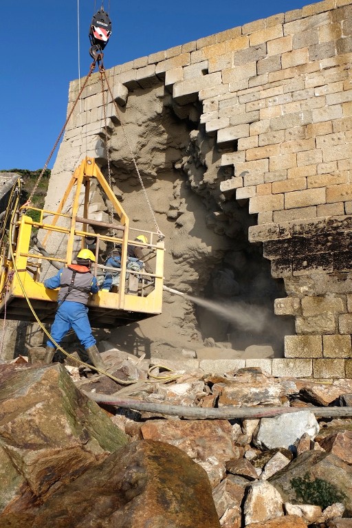 Vue des travaux de consolidation de 2015 : du béton est projeté sur la maçonnerie de la brèche de la batterie basse par des techniciens travaillant avec une nacelle suspendueImmatriculation