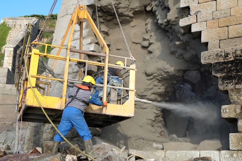 Vue des travaux de consolidation de 2015 : du béton est projeté sur la maçonnerie de la brèche de la batterie basse par des techniciens travaillant avec une nacelle suspendueImmatriculation