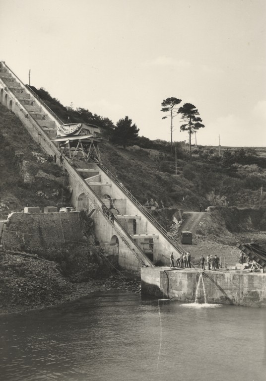 Vue de la rampe-funiculaire de la base dessais de radiodétection en construction, 27 octobre 1964 (collection : Service historique de la défense de Brest : 2 U 8, n° 117). Sur la rampe, le chariot funiculaire et le chariot viroleImmatriculation
