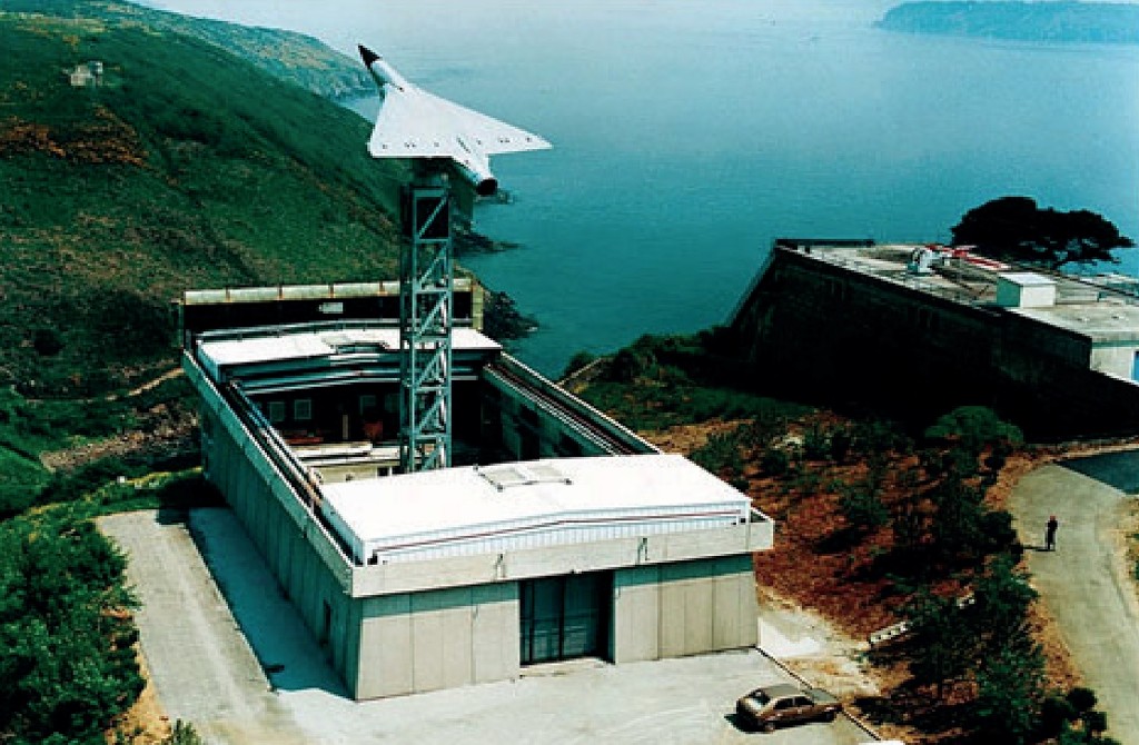 Vue aérienne oblique du bâtiment de la base d'essais de radiodétection du Mengant. Un pylône supportait une maquette davion à léchelle réelle. Cette installation a été déconstruiteImmatriculation