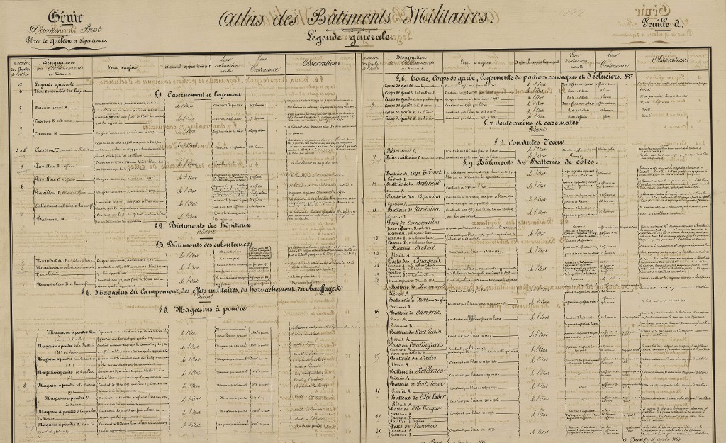 Atlas des bâtiments militaires des places de France : Brest, place de Quélern et dépendances, légende générale, feuille a, 1846Immatriculation