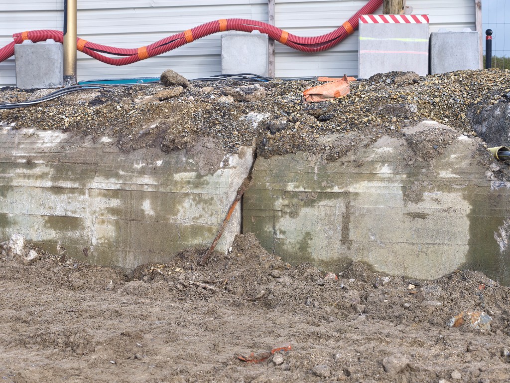 Vue depuis le sud-ouest : au centre, la fracture du bunker (couverture photographique du 22 janvier 2026). Sur la dalle de couverture du bunker passe la chaussée Éric TabarlyImmatriculation