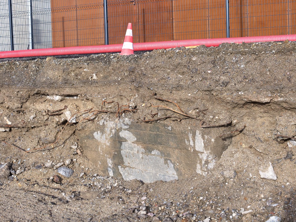 Vue depuis le sud (couverture photographique du 22 janvier 2026). Seul un pan de mur du bunker est visible depuis le chantier de la gare maritime du Naye. Au-dessus du bunker se trouve un transformateur électriqueImmatriculation