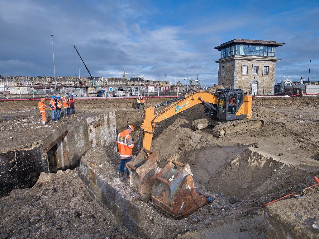 Vue générale depuis le sud (couverture photographique du 22 janvier 2026). Au premier plan, les vestiges du quai de l'avant-port de Saint-Servan. En arrière-plan à droite, le poste de commande de l'écluse du NayeImmatriculation