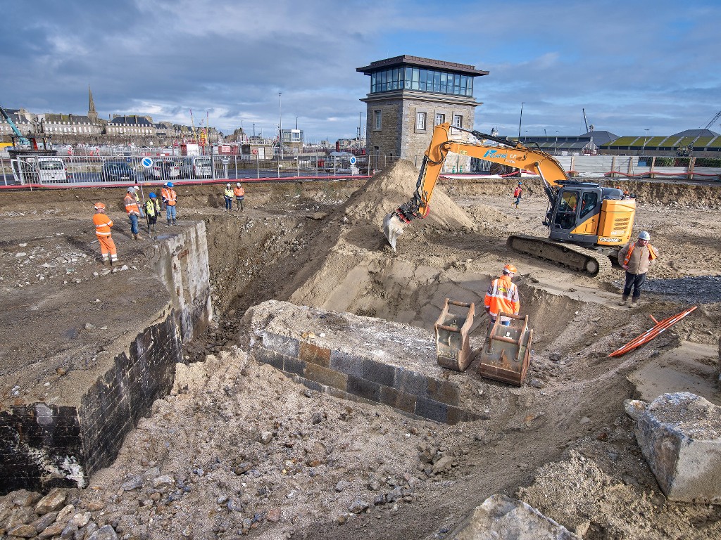 Vue générale depuis le sud (couverture photographique du 22 janvier 2026). Au centre, les vestiges du quai de l'avant-port de Saint-Servan. En arrière-plan, le poste de commande de l'écluse du NayeImmatriculation
