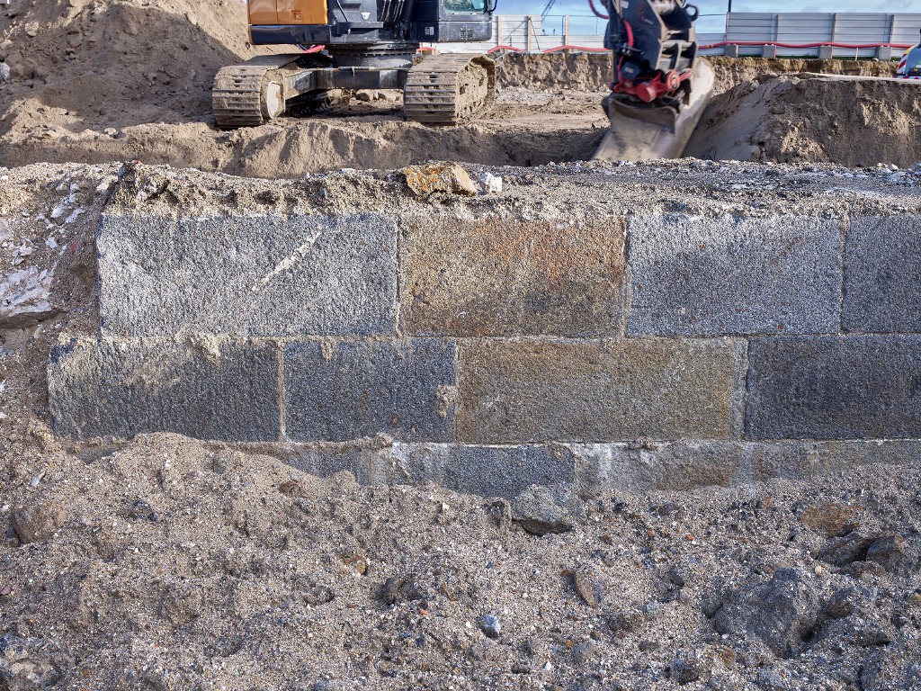 Vue de détail des vestiges de la digue de l'avant-port de Saint-Servan : élévation sud-ouest, maçonnerie en pierre de taille de granite (couverture photographique du 22 janvier 2026)Immatriculation