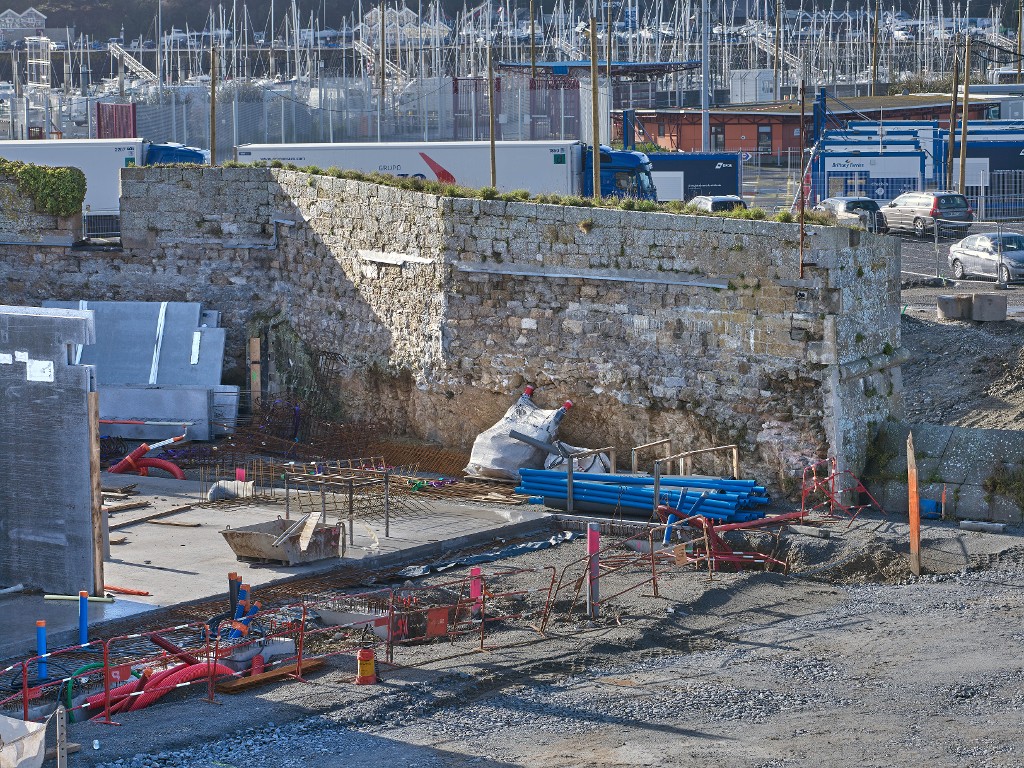 Vue depuis le nord-est : intérieur de l'escarpe (couverture photographique du 22 janvier 2026). A gauche et au premier plan, le chantier de la gare maritime du NayeImmatriculation