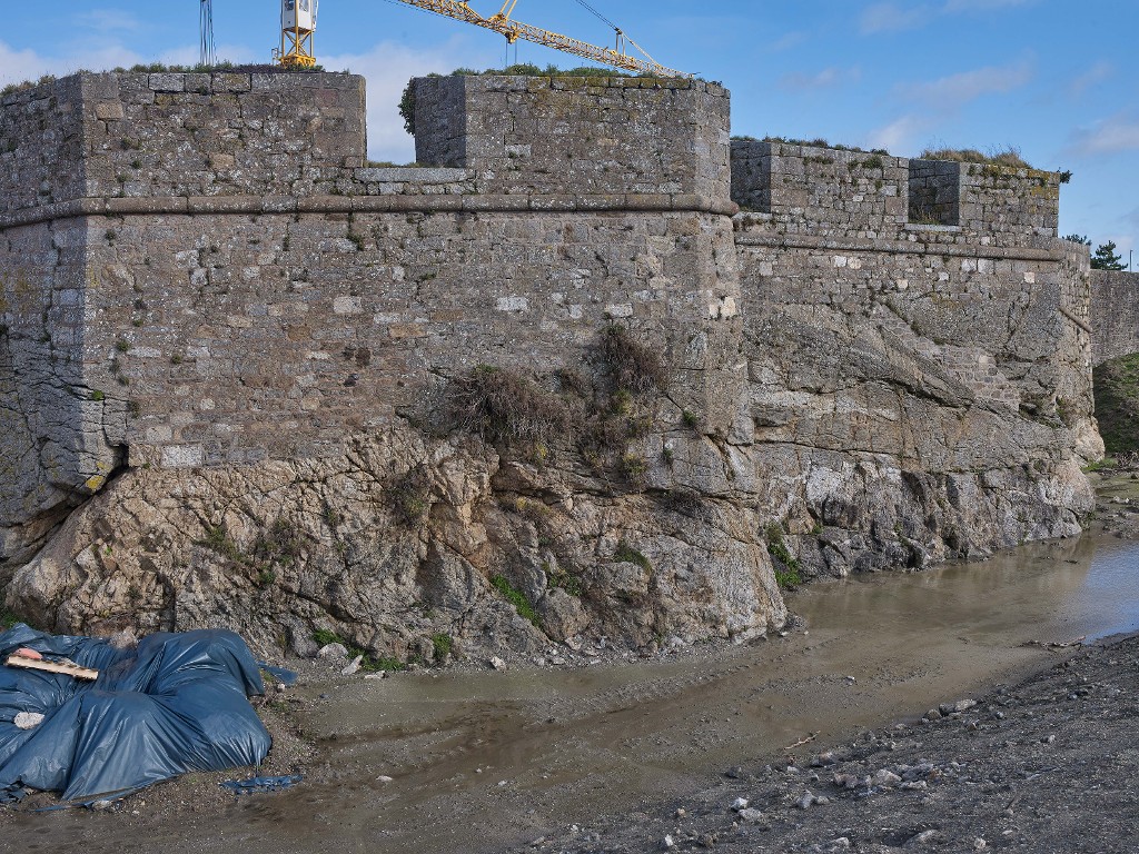 Vue générale depuis le sud-ouest (couverture photographique du 22 janvier 2026). Fondée sur le rocher, cette partie du fort est montée en maçonnerie de moellon et en pierre de taille. Son parapet est percé de trois embrasuresImmatriculation