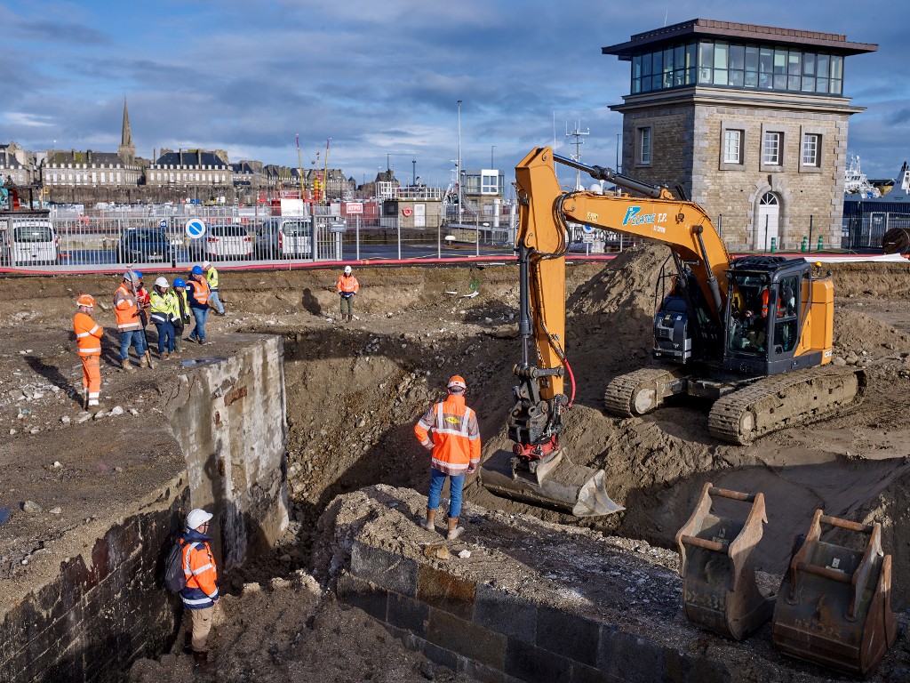 Vue de la réunion sur les vestiges archéologiques découverts lors du chantier : quai de l'avant-port de Saint-Servan et bunkers (couverture photographique du 22 janvier 2026). En arrière-plan, le poste de commande de l'écluse du NayeImmatriculation