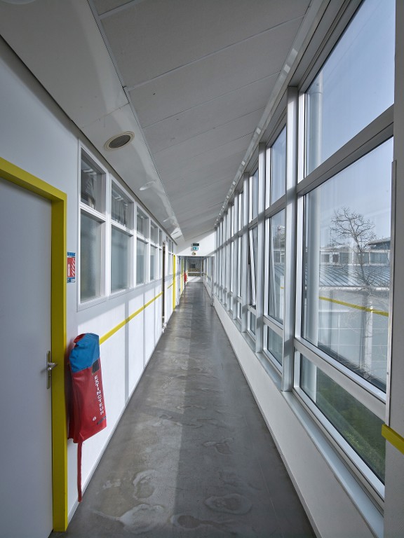 Bâtiment principal. Couloir latéral desservant les classes. Joël Y. Gautier, architecte, 1992.Immatriculation